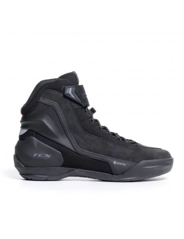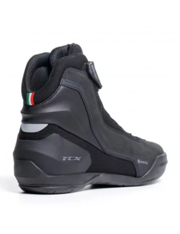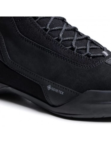 Botines TCX Jupiter 5 GORE-TEX negro. Jupiter 5 Gore-Tex® es un zapato de moto certificado diseñado para ofrecer protección, funcionalidad y confort en cualquier clima. La membrana Gore-Tex® Performance incorporada en el empeine ofrece un perfecto aislamiento de los elementos atmosféricos como la lluvia y las bajas temperaturas, combinado con un excelente grado de transpirabilidad, para ofrecer un confort total en todas las estaciones.La seguridad está garantizada por refuerzos en el talón y el maléolo, así como por la suela resistente a la deformación. Los cordones se mantienen en su lugar gracias a una correa especial con velcro. En la zona de contacto con el cambio hay un refuerzo para soportar el desgaste y proteger contra el contacto repetido con la palanca.La suela Groundtrax® cuenta con una lámina de goma y mezcla diseñadas para ofrecer un agarre ideal en los mandos de la moto y en el terreno incluso en condiciones de tierra mojada.