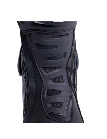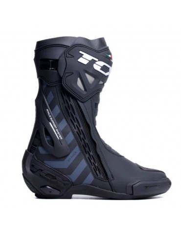 Botas TCX RT-Race negro / gris oscuro. La bota para moto RT-Race es una bota deportiva protectora y ligera, diseñada para disfrutar de la máxima seguridad y un control óptimo de la moto. Las RT-Race incorporan el Fasten Fit Control, un sistema de cierre interno conectado al forro de la bota a través de un cordón de deslizamiento rápido, que permite la máxima envoltura del empeine sobre el pie y una personalización milimétrica del ajuste. El sistema de cierre de la bota cuenta con una palanca de aluminio con ajuste micrométrico y liberación rápida, diseñada para adaptar perfectamente la caña a las diferentes anatomías de la pantorrilla, y con una cremallera lateral con panel elástico. Las botas para moto TCX RT-Race están equipadas con el sistema antitorsión Double Flex Control, una articulación de poliuretano colocada en la zona del tobillo capaz de controlar milimétricamente el movimiento ofreciendo un soporte y una flexibilidad óptima de la articulación, para evitar giros peligrosos y posibles traumatismos. La parte superior está hecha de microfibra con alta resistencia al desgaste. El forro interior está fabricado en tejido de malla transpirable AIR TECH y cuenta con un acolchado de grosores diferenciados situado en la zona del tobillo para ofrecer el máximo confort. Cuenta con sliders de poliuretano intercambiables en la puntera y en el talón para facilitar el deslizamiento en contacto con el asfalto. También presentan refuerzos adicionales a la altura de las zonas más expuestas, como la tibia, el tobillo, la puntera y el talón.
