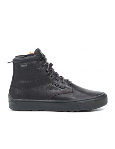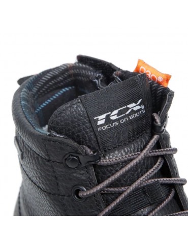 Zapatillas TCX Dartwood GTX negro. Fabricadas en piel de plena flor con membrana Gore-Tex que garantiza la máxima transpirablilidad. El cierre se efectúa mediante cremallera lateral y cordones con banda flexible donde puedes guardar los nudos y así evitar que se enganchen en los estribos de la moto. Las TCX Dartwood disponen de protecciones de última generación D3O en el maléolo además de otros protectores en la puntera y en el talón. La suela Groundtrax está desarrollada para garantizar estabilidad, adherencia y tracción tanto arriba de la moto como una vez bajo.