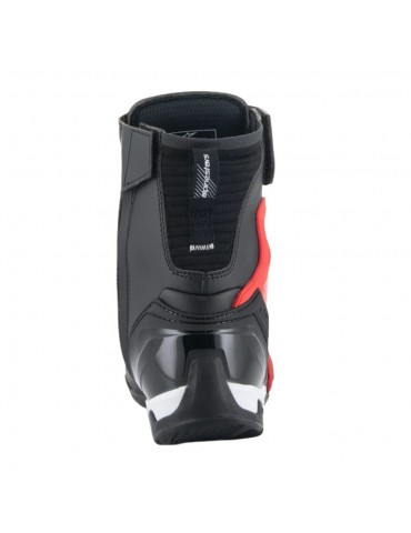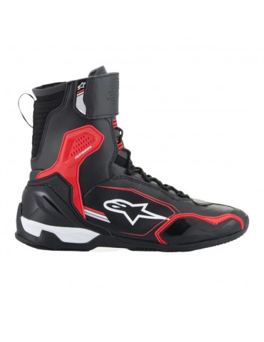Botines ALPINESTARS Superfaster negro / rojo brillante / blanco. Zapato de calce rápido y apertura larga con cremallera. Dispone de tobillera interna con protección contra impactos y extensión de cobertura del tendón de Aquiles, además, cuenta con refuerzos de TPR y talonera de TPU para mayor seguridad y comodidad.