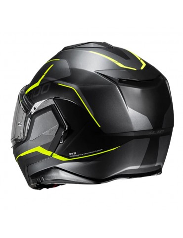 Casco HJC i100 Lorix MC3HSF. El i100 aporta un cambio a su casco modular cotidiano. Este casco cuenta con una mentonera de rotación completa que puede utilizarse tanto en configuraciones abiertas como en integral gracias a la doble homologación P/J. Un visor solar integrado fácil de usar (Ahumado Oscuro) se acciona por cable y se encuentra en la parte inferior izquierda del calota. Esta calota está compuesta por nuestro material de policarbonato avanzado. Este casco también está preparado para aceptar los sistemas Bluetooth SMART HJC (10B y 20B).