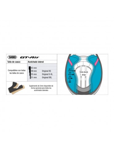 Recambio SHOEI GT-Air. Acolchado lateral para casco Shoei GT-Air .El grosor del acolchado se mide en milímetros. Para lograr un menor ajuste se utilizan medidas más delgadas, para lograr un mayor ajuste las medidas más gruesas. Todos los tamaños de acolchados son compatibles con todas las tallas.