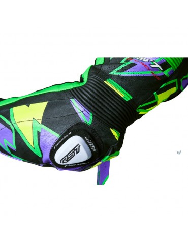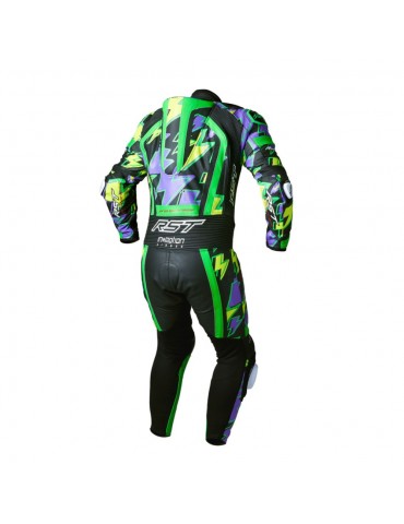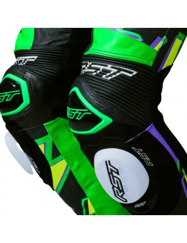 Suit RST PRO Series EVO Airbag neon green / purple bolt. The Pro Series Evo is the natural evolution of the 2021 Pro Series Suit and is a perfect option for track riding. The Pro Series Evo features a less aggressive cut than the V4.1. AAA certified, the Pro Series Evo uses stretch panels that allow for safe deployment of In&Motion's new essential airbag system. It includes a removable liner and comes complete with a range of striking colors that will turn heads.