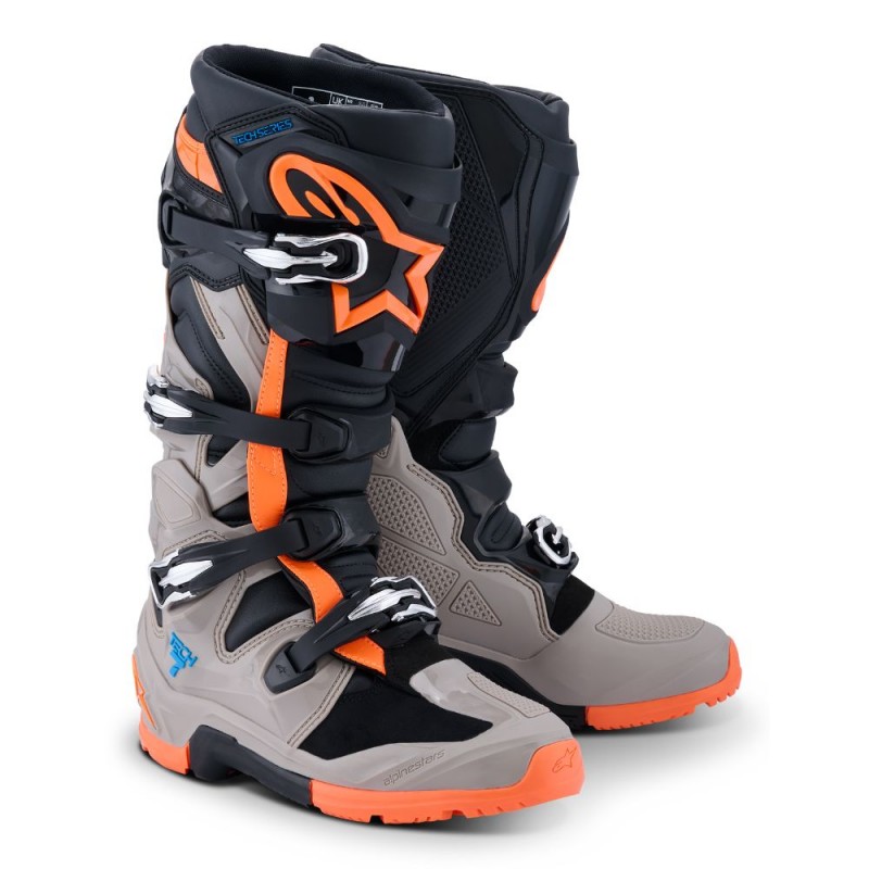Boots ALPINESTARS Tech 7 Enduro black / warm gray / orange fluo. It features a specially designed composite sole to offer enduro riders superior durability, grip, feel, and structural rigidity. This CE-certified boot promotes torso stability and flexibility through a biomechanical pivot, while offering excellent ankle protection. The boot's chassis has been designed to provide a complete feel and optimized interaction with the bike's controls, while the innovative buckle system allows for easy and precise closure.