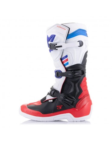 Boots ALPINESTARS Tech 3 white / bright red / dark blue. All-terrain and versatile with an incredible quality/price ratio. The Tech 3 offers an efficient fit, greater comfort and great durability.
