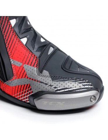 Boots TCX RT-Race PRO Air black / red / white. The RT-Race Pro Air motorcycle boots are the flagship model of the Racing line, the result of collaboration between the TCX Research and Development department and MotoGP riders. The RT-Race Pro Air features Fasten Fit Control, an internal closure system connected to the lining of the boot by means of a quick-sliding lace, which allows the maximum wrapping of the instep over the foot and a millimetric customization of the fit. The closure system of the boot features an aluminum lever with micrometric adjustment and quick release, designed to perfectly adapt the shank to the different anatomies of the calf, and a side zipper with elastic panel. The TCX RT-Race Pro Air motorcycle boots are equipped with the Double Flex Control anti-torsion system, a polyurethane joint positioned in the ankle area capable of millimetrically controlling the movement, offering optimal support and flexibility of the joint to avoid dangerous turns and possible trauma. The upper, made of highly wear-resistant microfiber, is perforated to ensure optimal ventilation of the foot and perfect comfort even at high temperatures. The inner lining is made of breathable AIR TECH mesh fabric and has a padding of differentiated thicknesses placed in the ankle area to offer maximum comfort. The "Burnout" sole, developed by TCX in collaboration with the Michelin® research center, is inspired by the Michelin "Power Supersport Evo®" tire and features a bi-mix tread with differentiated grip zones, designed to ensure a higher level of grip on the footpegs and controls and greater resistance to wear and abrasion against the asphalt. The profile is fully integrated into the instep and the heel has an angle inclination capable of guaranteeing optimal support on the stirrups. It has interchangeable magnesium sliders in the toe and heel to facilitate sliding in contact with the asphalt. They also feature additional polyurethane reinforcements at the most exposed areas such as the tibia, ankle, toe and heel.