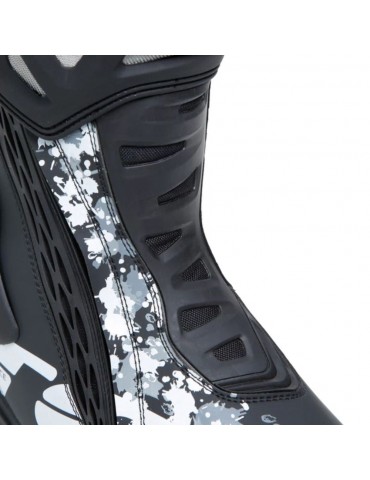 Boots TCX RT-Race black / white / gray. The RT-Race offer the same technical features as the high-end RT-Race Pro Air boots, but do not have the Michelin sole, micro-perforated panels and magnesium toe and rear sliders, being in this model made of polyurethane. The RT-Race features the latest advances in TCX technology to offer the rider the best of the best in protection, fit and sensitivity on the bike. Made of high-tech Microfiber, the TCX RT-Race boots feature the D.F.C. system that reduces the risk of joint hyperextension and ankle sprain. They incorporate the internal Fasten Fit Control (FFC) closure system for greater precision on the motorcycle.