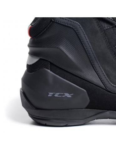 Booties TCX Jupiter 5 GORE-TEX black. Jupiter 5 Gore-Tex® is a certified motorcycle shoe designed to offer protection, functionality and comfort in any weather. The Gore-Tex® Performance membrane incorporated in the upper offers perfect insulation from atmospheric elements such as rain and low temperatures, combined with an excellent degree of breathability, to offer total comfort in all seasons.Safety is guaranteed by reinforcements in the heel and malleolus, as well as by the deformation-resistant sole. The laces are held in place by a special Velcro strap. In the area of contact with the gear shift there is a reinforcement to withstand wear and protect against repeated contact with the lever.The Groundtrax® sole features a rubber sheet and compound designed to offer ideal grip on the bike's controls and on the ground even in wet ground conditions.