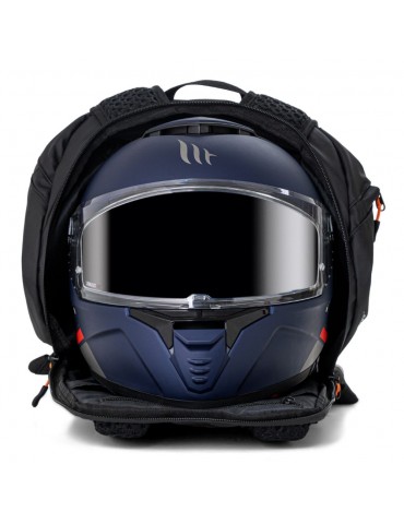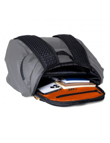 Backpack SEVENTY SD-TB3 gray. Practical anti-theft backpack of approximately 28 liters of capacity, minimalist and elegant design, designed to carry the helmet and much more. Main compartment with rear access zipper, with capacity for full-face helmet, opening in the back with extra wide access. It also has a divider flap for documents, laptop or tablet and a zippered pocket. Large front pocket for other items. Made of PU laminated polyester with zippers, water repellent. Quick-adjusting shoulder straps. Adjustable chest strap also height adjustable. Orange waterproof cover and reflective details. Padded and ventilated back and shoulder straps for maximum comfort on the move.