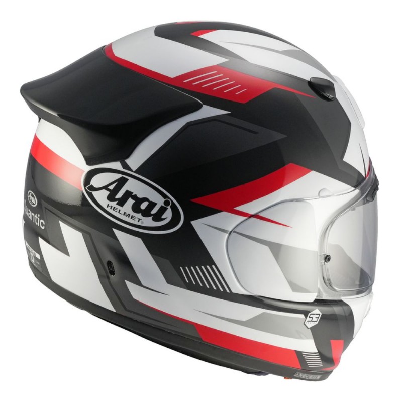 Helmet ARAI Quantic Supra red. This is the new ARAI motorcycle helmet that meets ECE R22-06 requirements. The outer shell is handcrafted and conforms to the natural shape of the human head. The helmet's surface is designed to be as smooth as possible, which, among other things, allows for better gliding. During a slide, the spoiler detaches, which does not compromise the helmet's safety. The inner shell is composed of five different densities of EPS, allowing for better energy absorption by combining a rigid outer shell with a soft inner one.