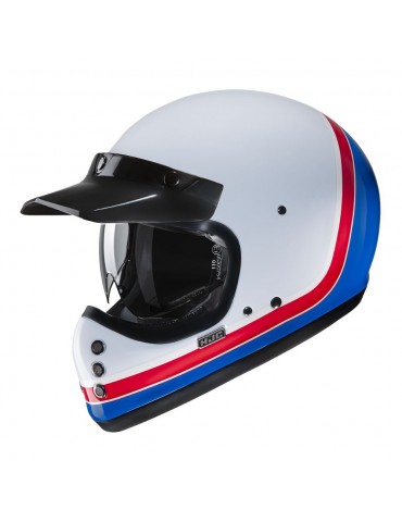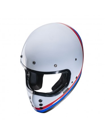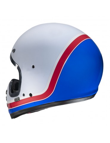 Helmet HJC V60 Scoby MC21. Full-face helmet with a retro-modern look homologated according to the new ECE twenty-two-six regulations. Inspired by the original FG-01 from the 1980s, the V60 goes beyond the vintage look with new-age features such as a lightweight fiberglass shell, a large IS-10 inner sun visor, built-in speaker holes, removable and washable interior, and emergency-release cheek pads for added safety. Stands out for offering a very comfortable wrap-around fit.