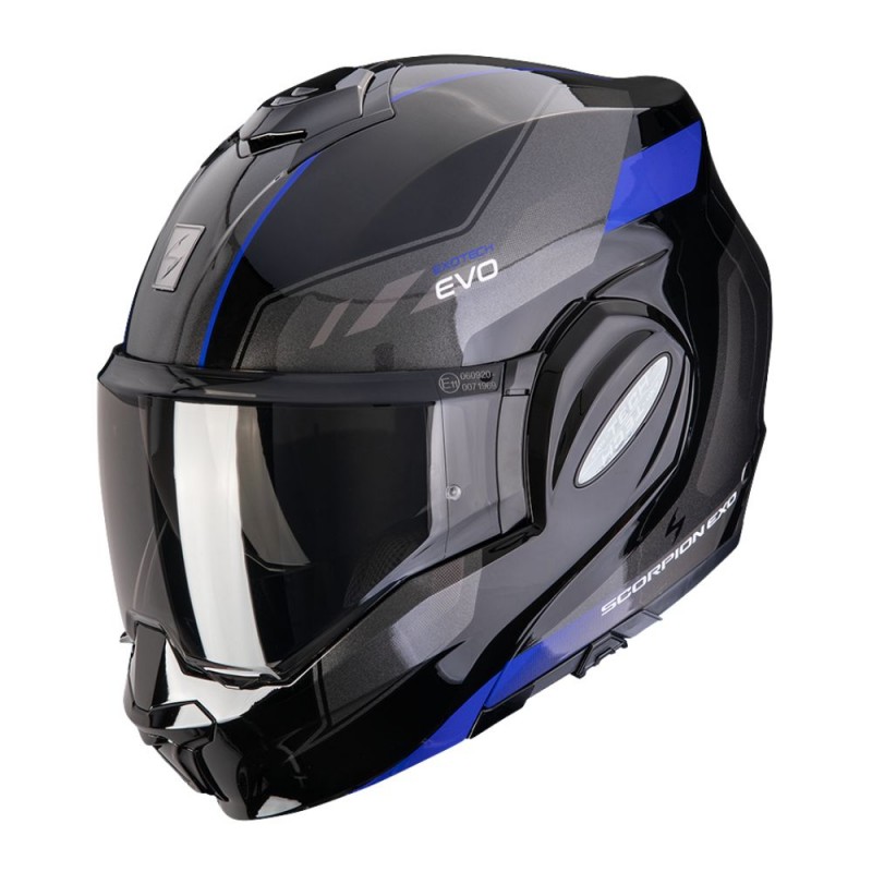 Helmet SCORPION EXO-Tech Evo Socius black / blue. The Scorpion EXO-Tech EVO Socius is a new generation modular helmet with a sporty design and dual P/J certification, ideal for those seeking versatility and safety on the road and in the city. Its compact, low-volume shell offers optimized aerodynamics and maximum comfort on long trips.