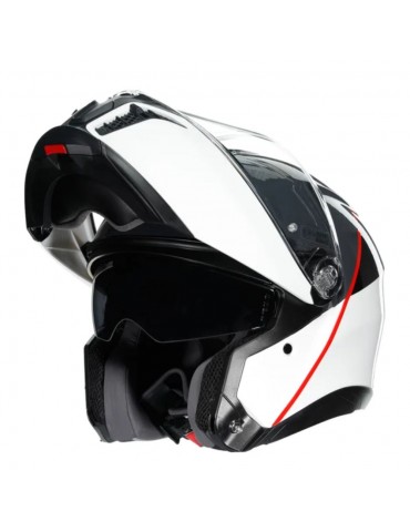 Helmet AGV Tourmodular Multi MPLK Balance white / gray / red. The new Tourmodular is homologated according to the new ECE 22.06 standard and the double P/J homologation. It is a very safe, comfortable modular helmet with integrated DMC Mesh communication system, the highest standard of wireless communication between motorcyclists. The Tourmodular has been developed to face long trips with maximum comfort and safety. Outer shell made of carbon fiber, aramidic fiber and fiberglass. Its soft interior made of Ritmo and Shalimar fabric with customization system of adjustment, ensures immediate absorption of moisture and sweat. It also has an integrated sun visor, as well as an efficient integrated ventilation system.