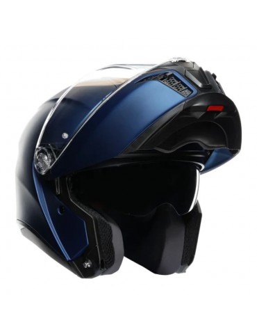 Helmet AGV Tourmodular Solid MPLK Galassia blue matt. The new Tourmodular is homologated according to the new ECE 22.06 standard and the double P/J homologation. It is a very safe, comfortable modular helmet with integrated DMC Mesh communication system, the highest standard of wireless communication between motorcyclists. The Tourmodular has been developed to face long trips with maximum comfort and safety. Outer shell made of carbon fiber, aramidic fiber and fiberglass. Its soft interior made of Ritmo and Shalimar fabric with customization system of adjustment, ensures immediate absorption of moisture and sweat. It also has an integrated sun visor, as well as an efficient integrated ventilation system.