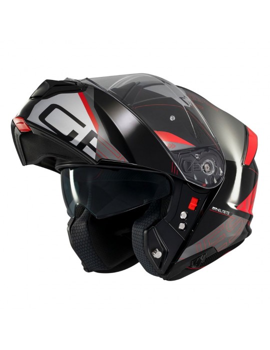 - Single-handed chin guard opening system (one-hand operation) with P/J homologation that allows riding with the chin guard open or closed.