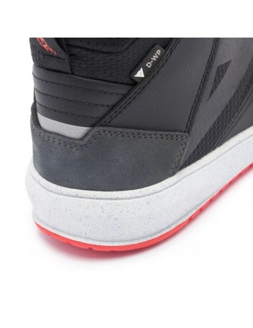 Booties DAINESE Suburb D-WP black / white / red-lava. Waterproof urban sneakers inspired by the sneaker world. Equipped with Groundtrax® soles with asymmetrical design and mesh upper and crust, versatile, for use also when getting off the bike.