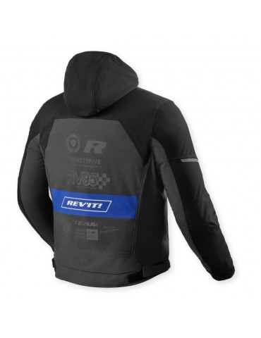 Jacket REVIT Haste H2O black / blue. Discover the Haste H2O jacket, a bold and waterproof addition to the REV'IT! Ninety-Five Capsule collection. Its vintage feel with a modern twist comes from its patches and bold colors combined with a color-blocked canvas, with an inner lining with flashes of vibrant color. To protect you from the elements, this jacket features a waterproof Hydratex|Mesh G-liner and a removable thermal liner for extra warmth.