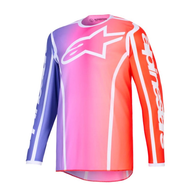 Jersey ALPINESTARS Fluid Apex multicolor. The Fluid line offers recreational motocross riders gear with optimal MX technology that leverages key construction features from the Supertech, Techstar, and Racer lines for total look and performance, optimized for comfort and functionality while riding. Developed and tested in some of the world's most demanding terrain, the Fluid line with its sporty fit is ideal for many forms of off-road riding and offers the most relaxed fit of all MX26 gear lines.