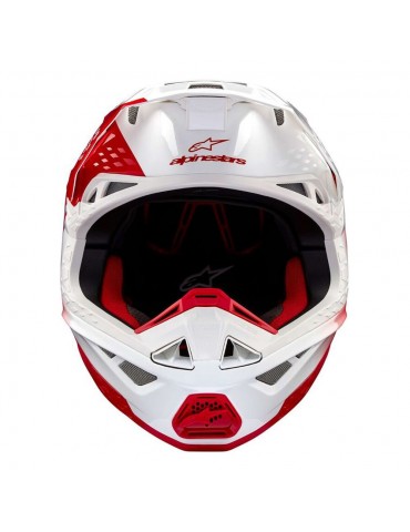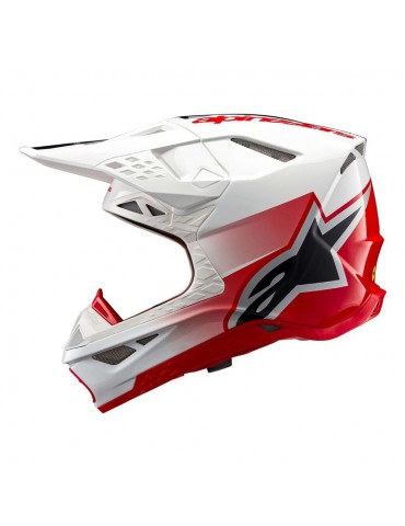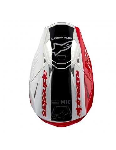 Helmet ALPINESTARS Supertech S-M10 Unite red / white glossy. The design of the S-M10 offers an aerodynamic, attractive and smooth profile, streamlined and free of external channels and features that could act as a load point in an impact or compromise the overall integrity of the helmet's construction. The curvature of the surface promotes reduced friction on impact, allowing for deflection and more efficient energy transfer to protect the rider's head from direct force to the skull and referred to the neck and spine.