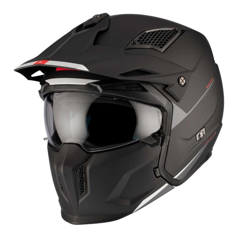 Helmet MT SV Streetfighter SV S Solid A1 black matte. The Streetfighter SV S is a casual helmet that has been a huge hit with motorcyclists who live life to the fullest and aren't afraid to show their true selves. A modular and versatile helmet with a significant dose of aggressiveness and character that, like all of the brand's creations, also offers very high levels of safety at an unbeatable price. Modular, versatile, and aggressive. A perfect combination for the most intrepid motorcyclists.