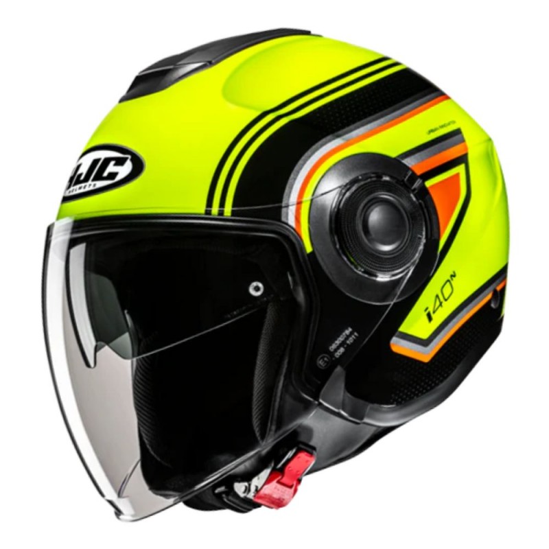 Helmet HJC i40N Linia MC3H. The i40n is a compact and stylish urban semi-jet helmet, composed of an advanced polycarbonate material that offers a lightweight and comfortable helmet with a superior fit thanks to advanced CAD technology and Ece 22.06 approval. The helmet has an integrated dark smoke sun visor that can be quickly and easily adjusted and the anti-bacterial fabric interior is removable, washable and Bluetooth communication ready, making the i40n the perfect urban helmet for everyday use.