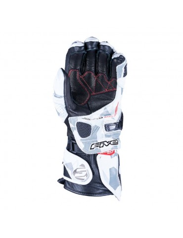 Gloves FIVE RFX1 Replica camo / white. Intended for a sporty use bringing together all the peculiarities of a high-end glove with an unusual touch and a very light weight with only 170gr with all the peculiarities of a high-end glove. PU knuckle protections and a large carbon protection to protect the forearm. Kevlar liner, carbon and cowhide palm reinforcements for added protection, stretch Kevlar for ease of movement; protects both the palm and upper hand and offers an unusual fit at a reduced weight. It also features a new construction of stretch Kevlar and leather (instead of just leather) on the thumb for greater comfort. The palm features a Digital Pittards leather reinforcement for perfect grip in wet conditions. The adjustment strap is hidden under a protective cowhide flap to reduce the danger of the glove breaking in the event of a fall.