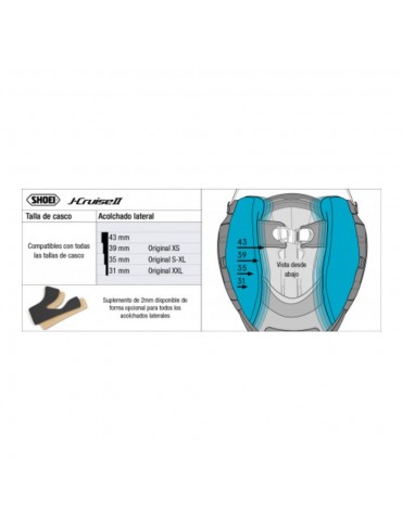 Replacement SHOEI J-Cruise 2. Original side padding for Shoei J-Cruise 2 helmet. The thickness of the padding is measured in millimeters. To achieve a smaller fit thinner measures are used, to achieve a greater fit thicker measures. All padding sizes are compatible with all sizes.
