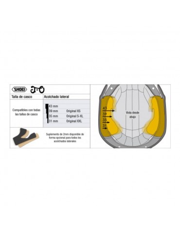 Replacement SHOEI JO. Side padding for Shoei JO helmet. The thickness of the padding is measured in millimeters. To achieve a smaller fit thinner measures are used, to achieve a greater fit thicker measures. All padding sizes are compatible with all sizes.