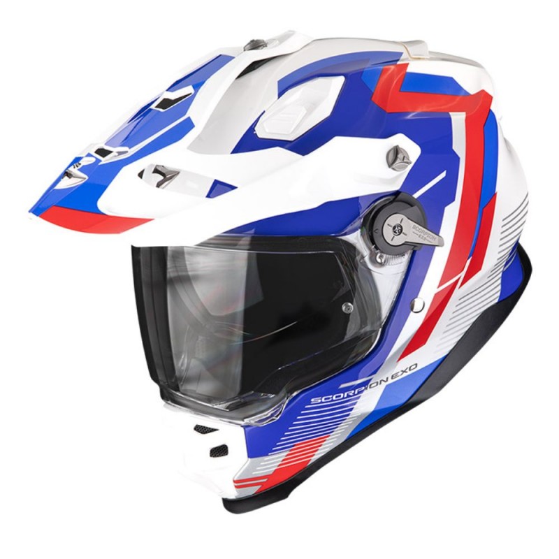 Helmet SCORPION ADF-9000 Air Patrol white / blue / red. The new ADF-9000 Air was designed to meet the demands of the serious adventure rider by achieving the perfect balance of features and benefits both on and off-road.Each helmet is carefully handcrafted using the latest TCT Ultra technology, providing superior strength and light weight.