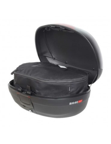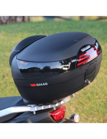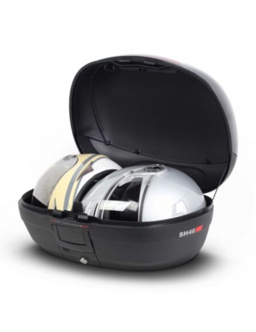 Top case SHAD SH46. The SH46 top case has capacity for 2 full-face helmets, perfect for medium and large displacement motorcycles or scooters. Designed in Barcelona, it has a renewed design with curved shapes and black reflectors along with three minimalist red lines.
