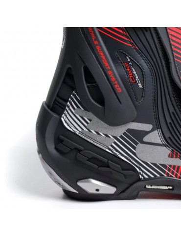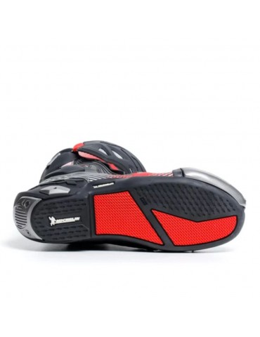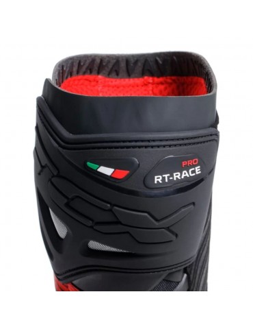 Botas TCX RT-Race PRO Air negro / rojo / blanco. Las botas para moto RT-Race Pro Air son el modelo insignia de la línea Racing, fruto de la colaboración entre el departamento de Investigación y Desarrollo de TCX y los pilotos de MotoGP. Las RT-Race Pro Air incorporan el Fasten Fit Control, un sistema de cierre interno conectado al forro de la bota a través de un cordón de deslizamiento rápido, que permite la máxima envoltura del empeine sobre el pie y una personalización milimétrica del ajuste. El sistema de cierre de la bota cuenta con una palanca de aluminio con ajuste micrométrico y liberación rápida, diseñada para adaptar perfectamente la caña a las diferentes anatomías de la pantorrilla, y con una cremallera lateral con panel elástico. Las botas para moto TCX RT-Race Pro Air están equipadas con el sistema antitorsión Double Flex Control, una articulación de poliuretano colocada en la zona del tobillo capaz de controlar milimétricamente el movimiento ofreciendo un soporte y una flexibilidad óptima de la articulación, para evitar giros peligrosos y posibles traumatismos. El empeine, fabricado en microfibra de alta resistencia al desgaste, está perforado para garantizar una ventilación óptima del pie y disfrutar de una comodidad perfecta incluso a altas temperaturas. El forro interior está fabricado en tejido de malla transpirable AIR TECH y cuenta con un acolchado de grosores diferenciados colocado en la zona del tobillo para ofrecer el máximo confort. La suela «Burnout», realizada por TCX en colaboración con el centro de investigación de Michelin®, está inspirada en el neumático de Michelin «Power Supersport Evo®» y cuenta con una banda de rodadura bimezcla con zonas de agarre diferenciadas, diseñada para garantizar un mayor nivel de agarre en los estribos y mandos y una mayor resistencia al desgaste y la abrasión contra el asfalto. El perfil está totalmente integrado en el empeine y el tacón tiene una inclinación del ángulo capaz de garantizar un soporte óptimo en los estribos. Cuenta con sliders de magnesio intercambiables en la puntera y en el talón para facilitar el deslizamiento en contacto con el asfalto. También presentan refuerzos adicionales de poliuretano a la altura de las zonas más expuestas, como la tibia, el tobillo, la puntera y el talón.