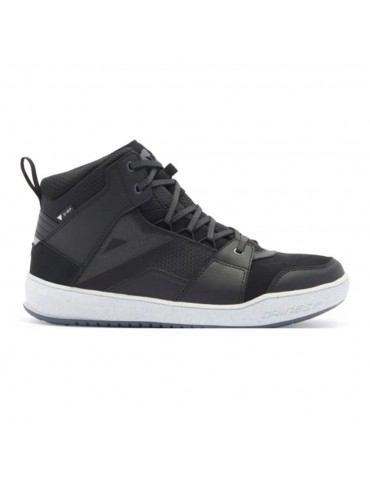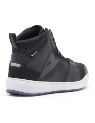 Botines DAINESE Suburb D-WP negro / blanco / iron-gate. Zapatillas urbanas impermeables inspiradas en el mundo de las sneakers. Equipadas con suelas Groundtrax® con diseño asimétrico y empeine de malla y costra, versátiles, para usarlas también al bajarse de la moto.