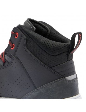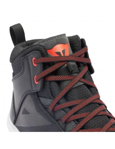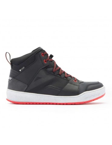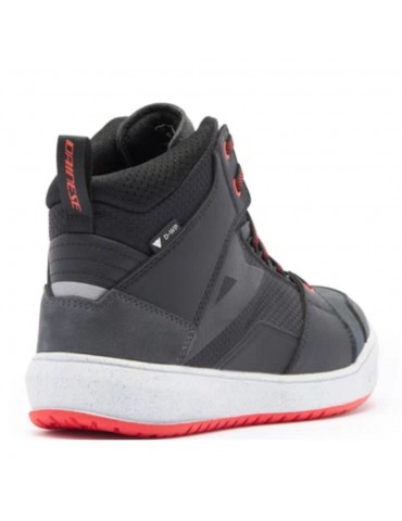 Botines DAINESE Suburb D-WP negro / blanco / rojo-lava. Zapatillas urbanas impermeables inspiradas en el mundo de las sneakers. Equipadas con suelas Groundtrax® con diseño asimétrico y empeine de malla y costra, versátiles, para usarlas también al bajarse de la moto.