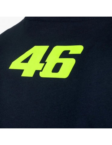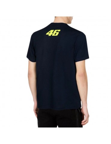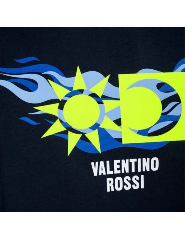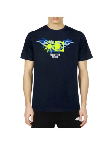 Camiseta VR46 WRT azul. Camiseta de algodón perteneciente a la colección VR46 WRT 2023. La camiseta, de corte regular, presenta el estampado Sun Moon en la parte delantera y las características llamas del casco que lleva Valentino Rossi durante las carreras. En la espalda el estampado del número 46.