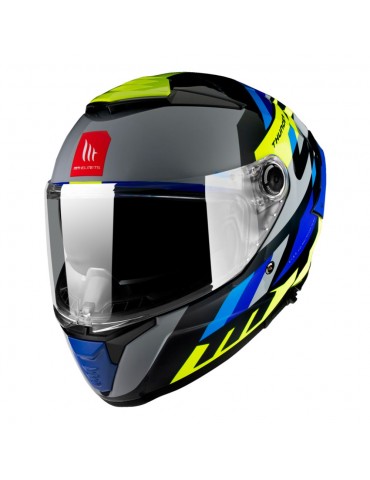 Casco MT FF118SV Thunder 4 SV Ergo E17 azul brillo. Thunder 4 SV FF118SV es el primer casco integral de MT Helmets en introducir la nueva homologación ECE 22.06. El casco está dotado de los últimos avances tecnológicos que son el resultado de la experiencia adquirida en las competiciones más prestigiosas. Está realizado en HIRP, una fórmula mejorada de polímeros inyectados en bloques muy precisos que proporciona mayor resistencia contra los impactos con un peso reducido.