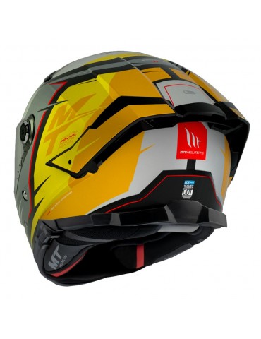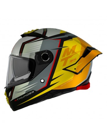 Casco MT FF118SV Thunder 4 SV Pental B3 amarillo perla mate. Thunder 4 SV FF118SV es el primer casco integral de MT Helmets en introducir la nueva homologación ECE 22.06. El casco está dotado de los últimos avances tecnológicos que son el resultado de la experiencia adquirida en las competiciones más prestigiosas. Está realizado en HIRP, una fórmula mejorada de polímeros inyectados en bloques muy precisos que proporciona mayor resistencia contra los impactos con un peso reducido.
