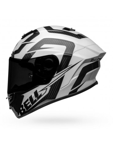 Casco BELL Race Star DLX Flex Labyrinth blanco brillante / negro. Con un nuevo ajuste y equipado con nuestra pantalla ProTint™, el Race Star DLX Flex es la elección definitiva para el piloto con un trabajo diario, donde cada decisión de fin de semana de carrera cuenta. Ofreciendo todas las características de su hermano líder en su clase, el Race Star utiliza una carcasa de fibra de carbono 3k y está repleto de tecnología de vanguardia para ofrecer un rendimiento de primera clase. Nuestro forro patentado Flex ayuda a proporcionar una protección completa, mientras que las almohadillas Magnefusion en las mejillas garantizan un confort superior con un ajuste óptimo, y la orientación RaceView le ofrece una visión perfecta de la línea de meta. El deseo de ganar empieza en la cabeza.