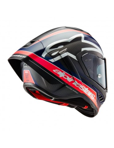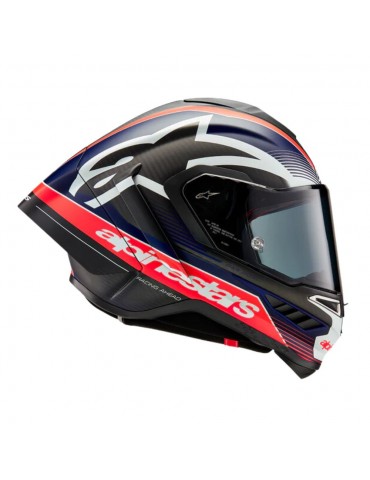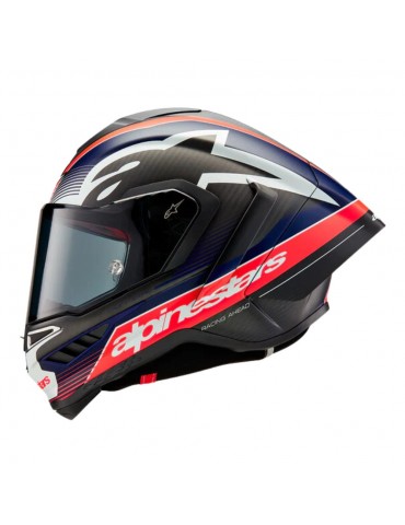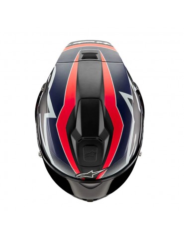 Casco ALPINESTARS Supertech R10 Team ECE06/DOT/FIM negro / rojo carbón / azul mate. Como resultado de más de 10 años de estudio, desarrollo y pruebas intensivos, el objetivo de la familia de cascos Supertech es crear los cascos más avanzados, protectores y que mejoren el rendimiento posibles para corredores y ciclistas de todo el mundo. Después de años de extensa investigación, desarrollo y pruebas del casco de carreras de carretera Supertech R10 por parte del Departamento de Desarrollo de Productos de Cascos de Alpinestars, junto con la leyenda de MotoGP Andrea Dovizioso y los pilotos de MotoGP Jorge Martin y Jack Miller. Con el S-R10, el objetivo del diseño fue garantizar el más alto nivel de rendimiento, especialmente en lo que respecta a protección y un nuevo nivel de seguridad.