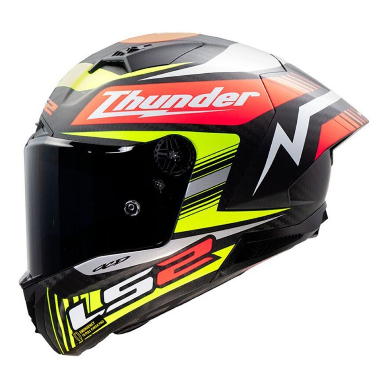 Casco LS2 FF805 Thunder GP Aero Replica negro. El FF805 Thunder es el nuevo casco integral racing de LS2. Fabricado en fibra de carbono, cuenta con los últimos avances tecnológicos de la marca derivados de MotoGP. Dispone de una amplia pantalla muy resistente con predisposición para pinlock (incluido), de un avanzado sistema de ventilación y de unos acolchados interiores muy confortables. Cuenta con sistema de extracción de emergencia.