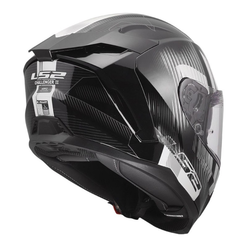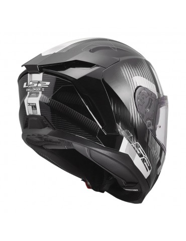 Casco LS2 FF817 Challenger II Nitro negro brillante / gris. Un casco de turismo de alto rendimiento diseñado para viajes largos. Fabricado con nuestro HPFC, que combina ligereza y seguridad excepcional. Equipado con una excelente visión periférica y un visor solar integrado. Equipado con Pinlock 120 XLT Max Visión para mayor seguridad.