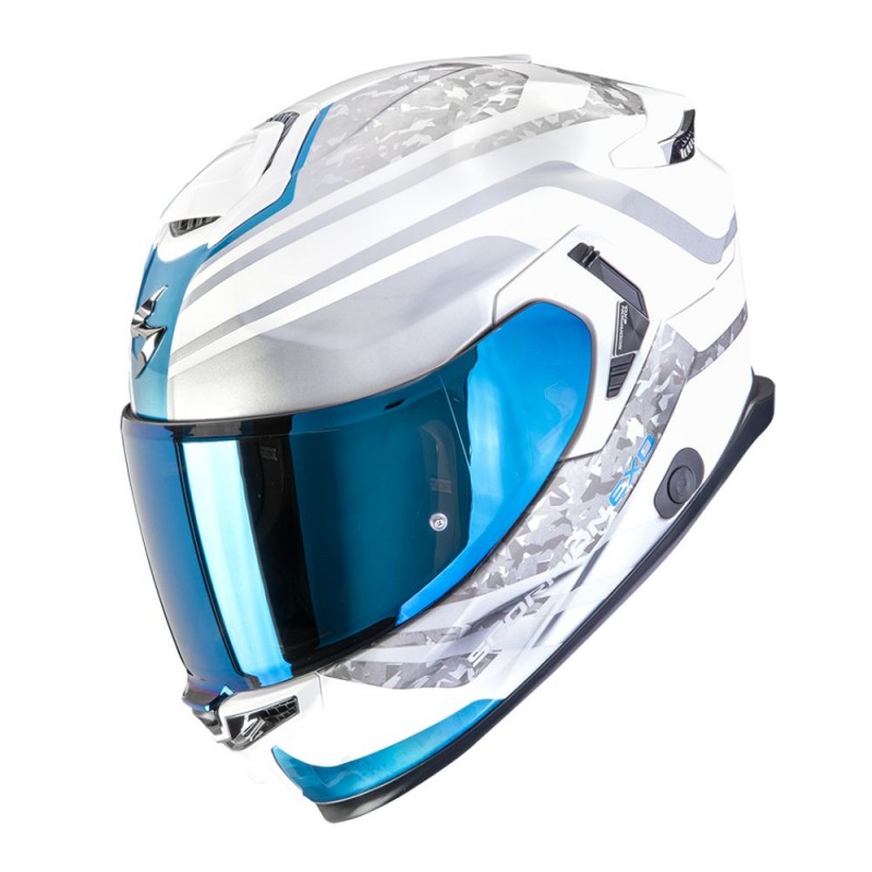 Casco SCORPION EXO-GT SP Air Arten blanco / azul. El Scorpion EXO-GT SP Air Arten representa la nueva generación de cascos touring premium, diseñado para quienes buscan máxima seguridad, silencio y confort en largos trayectos. Su calota prepreg de carbono 3K Twill y Chopped ofrece una absorción de impactos superior con gran ligereza, mientras que la pantalla y visor solar asféricos de Clase Óptica 1 aseguran una visión nítida y sin distorsiones.