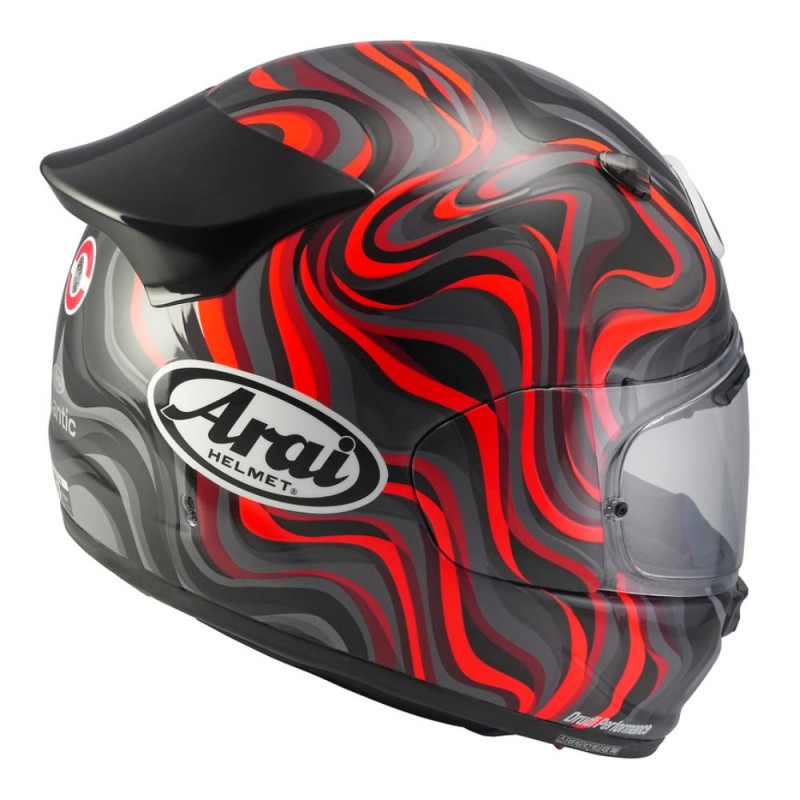 Casco ARAI Quantic SWIRL rojo. Es el nuevo casco de motocicleta ARAI que cumple con los requisitos ECE R22-06 . La calota exterior está hecha a mano y se adapta a la forma natural de la cabeza humana. La superficie del casco está diseñada para ser lo más suave posible, lo que, entre otras cosas, permite un mejor deslizamiento. Durante el deslizamiento, el alerón se desprende, lo que no compromete la seguridad del casco. La calota interior está compuesta por 5 densidades diferentes de EPS, lo que permite una mejor absorción de energía del Quantic al combinar una calota exterior rígida y una interior blanda.