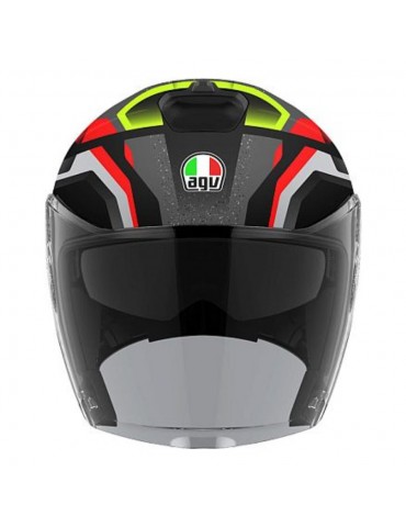 Casco AGV Irides Zurigo negro / rojo / amarillo fluo. Irides es un casco jet AGV homologado ECE 22.06 fabricado en material termoplástico, diseñado para proporcionar protección y comodidad en el tráfico urbano diario.