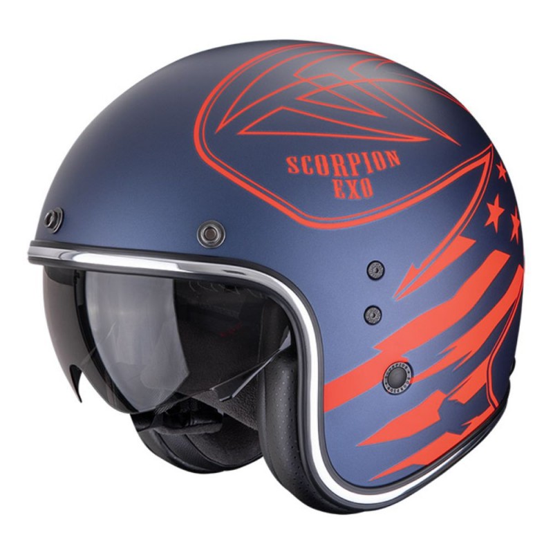Casco SCORPION Belfast Evo Dawg azul mate / rojo. Casco tipo jet que combina entre un look moderno y retro, ideal para la conducción urbana. Su calota exterior ha sido fabricada en Ultra TCT® con fibra de vidrio que ofrece genial protección. Dispone de visor solar Speedview™ y acolchados interiores Kwikwick 2™ muy agradables y sencillamente desmontables y lavables.