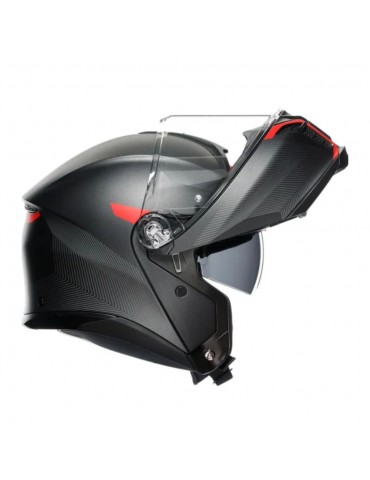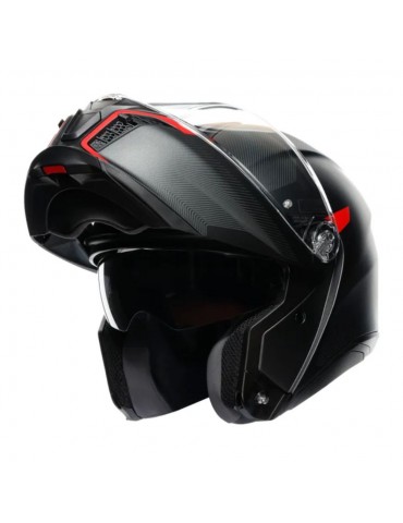 Casco AGV Tourmodular Multi MPLK Frecuencia mate gunmetal / rojo. El nuevo Tourmodular está homologado conforme la nueva normativa ECE 22.06 y la doble homologación P/J. Se trata de un casco modular segurísimo, agradable y con sistema de comunicación DMC Mesh integrado, el más alto estándar de comunicación inalámbrica entre motoristas. El Tourmodular ha sido desarrollado para encarar largos viajes con la máxima comodidad y seguridad. Calota exterior fabricada en fibra de carbono, fibra aramídica y fibra de vidrio. Su suave interior confeccionado en tejido Ritmo y Shalimar con sistema de personalización del ajuste, garantiza la absorción inmediata de la humedad y el sudor. Cuenta, además de esto, con visor solar integrado, como con un eficiente sistema de ventilación integrado.