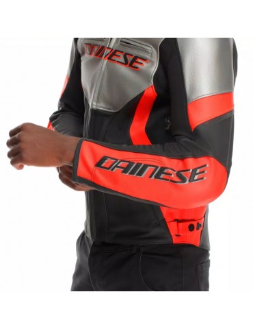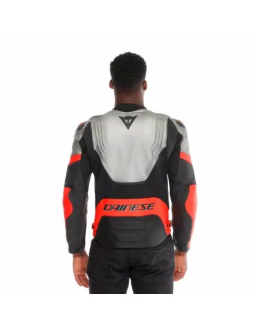 Chaqueta DAINESE Racing 5 plata / negro / rojo fluor. La Racing 5 es la chaqueta de moto con un ajuste regular y deportivo hecha por una fina piel de vaca Tutu de 1,2 mm. Un enfoque en la ergonomía llevó a estudios sobre las posiciones de conducción, para perfeccionar los detalles.