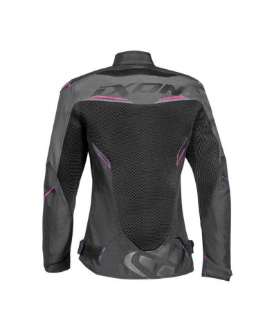 Chaqueta IXON Draco Lady negro / antracita / fucsia. Chaqueta textil deportiva para mujer con diseño derivado de la gama de competición de Ixon. Confeccionada en tejido de poliéster 600D de alta resistencia a la abrasión con extensos paneles de malla horadada 3D para una genial ventilación en la temporada estival. Incorpora protectores de codos y hombros certificados por la CE (Nivel 2) y sliders externos en lo hombros para mayor seguridad.