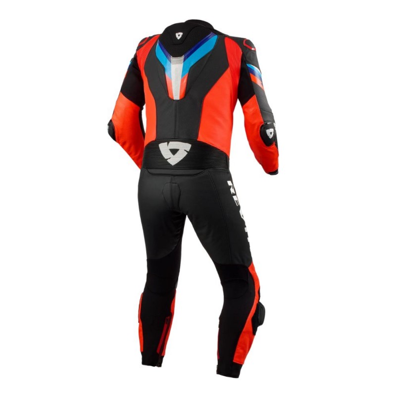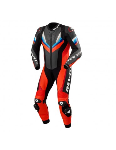 Traje de cuero REVIT Quantum 3 1PC rojo neón / negro. El traje de una pieza Quantum 3. Lidera el grupo en términos de lenguaje de diseño, características de seguridad y estilo deportivo general.