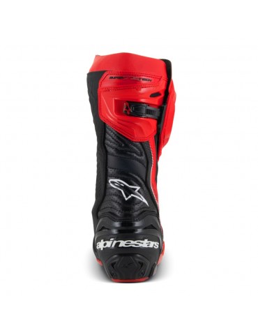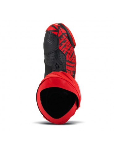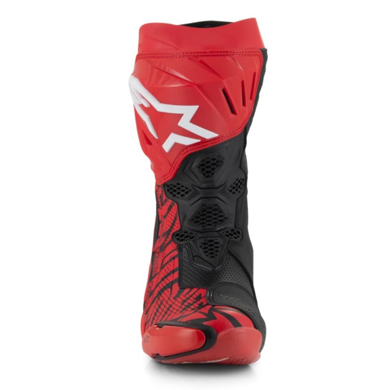 Botas ALPINESTARS Supertech R Vented Edición Limitada Pecco Bagnaia rojo / negro. Introducidas en 2025 y diseñadas para pilotos de carretera, las Supertech R LE Pecco Bagnaia Ventiladas ofrecen ventilación y control para pista en verano. Certificadas CE EN13634:2017, combinan microfibra perforada con láser, placa tibial de TPU rediseñada, deslizaderas reemplazables y botín interior biomecánico de malla 3D para absorber impactos y canalizar el aire. Panel elástico de TPU, microtrinquete y suela de goma adherente optimizan ajuste y sensibilidad en los estribos.