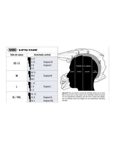 Recambio SHOEI VFX-WR. Acolchado central para casco Shoei VFX-WR .El grosor del acolchado se mide en milímetros. Para lograr un menor ajuste se utilizan medidas más delgadas, para lograr un mayor ajuste las medidas más gruesas. Comprobar tabla de tallas para cada acolchado.